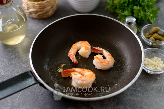Положите остывшие хвосты креветок и каперсы.