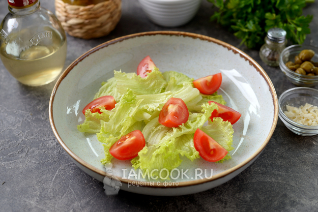 Пока хвосты креветок остывают, выложите порванные руками листья салата и нарезанные четвертинками помидоры черри на блюдо.