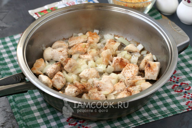 В сковороде разогреть растительное масло, добавить кусочки курицы и обжарить до золотистой корочки. Добавить в сковороду лук, перемешать и обжарить пару минут.