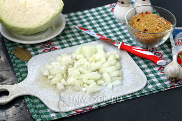 Почистить и нарезать кубиками лук.