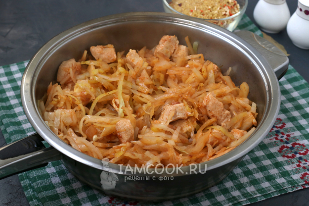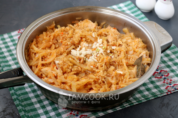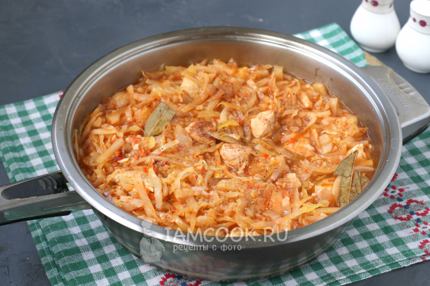 Добавить в сковороду капусту. Томатную пасту разбавить в 150 мл воды и добавить к капусте. Блюдо посолить и поперчить, накрыть сковороду крышкой и готовить 10 минут на среднем огне.