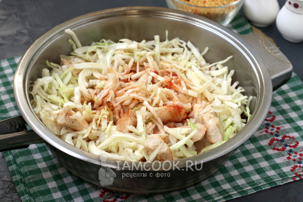 Спустя это время капуста станет мягкой и можно добавлять булгур.