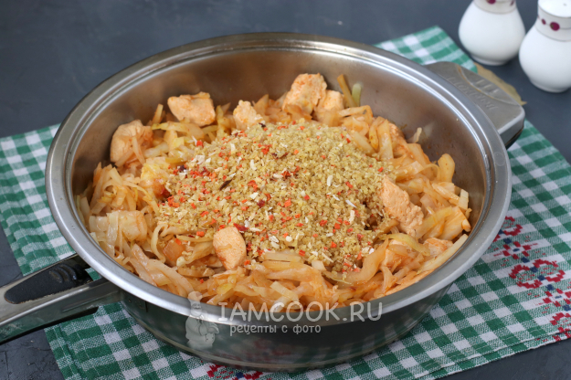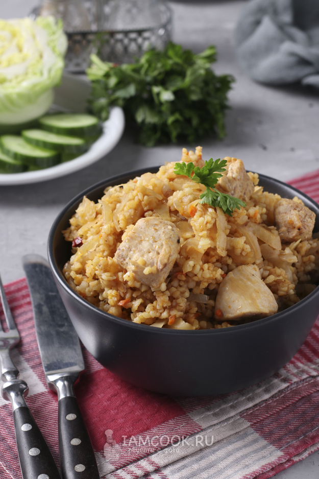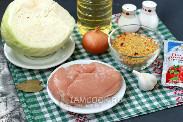 Для приготовления булгура с курицей и капустой в сковороде подготовить из списка необходимые ингредиенты.