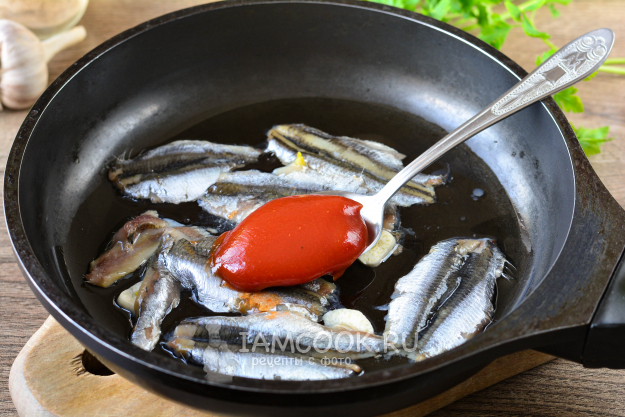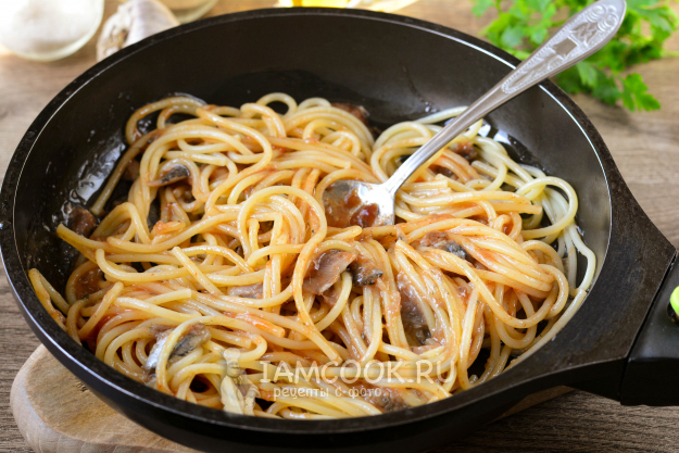 Перемешайте пасту с анчоусами, подержите на огне ещё пару минут, и готово. Поперчите по вкусу.