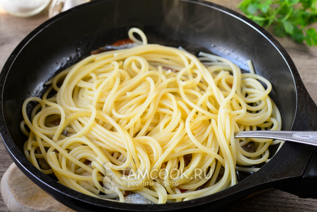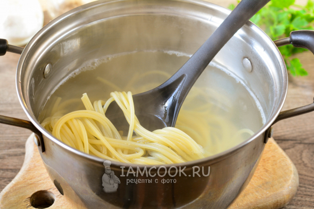 Вскипятите достаточное количество воды, посолите и варите спагетти 7-8 минут. После чего слейте воду.