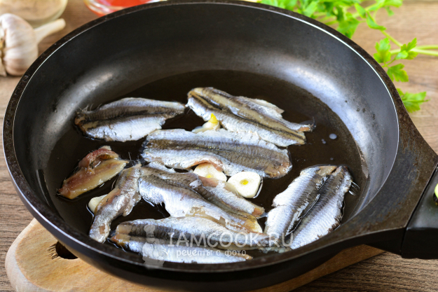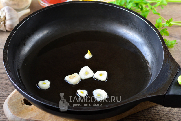 Разогрейте оливковое масло на сковороде, добавьте нарезанный крупными кусочками чеснок. Слегка обжарьте чеснок, помешивая.
