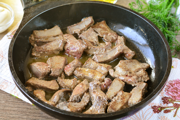 Обжаривайте свиную печень 5-7 минут, помешивая. Добавьте соль и перец по вкусу.