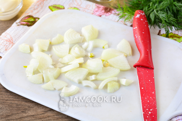 Очищенный лук нарежьте четверть-кольцами.