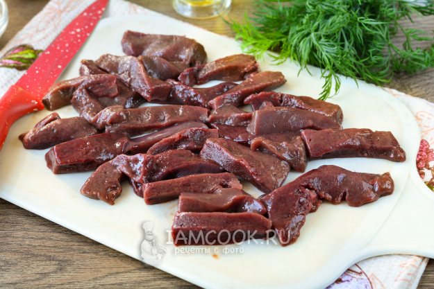 Промойте и почистите свиную печень, затем нарежьте удлиненными полосками.