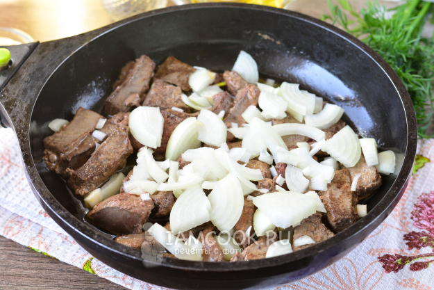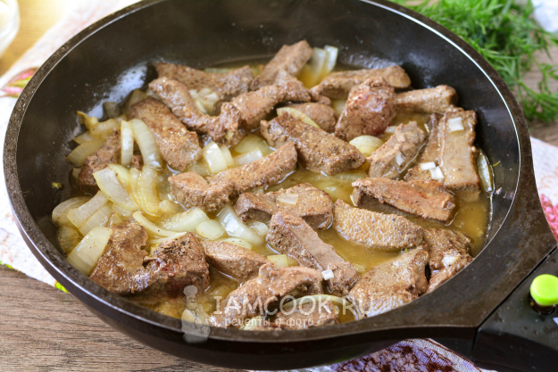 Обжаривайте печень с луком еще пару минут. Влейте немного воды.