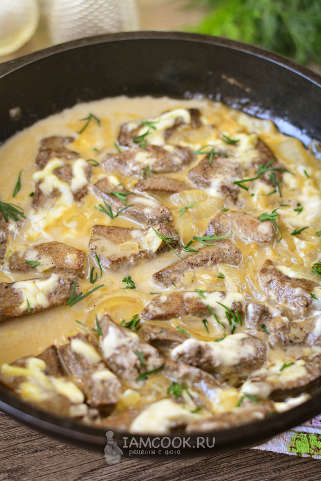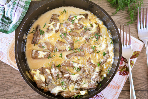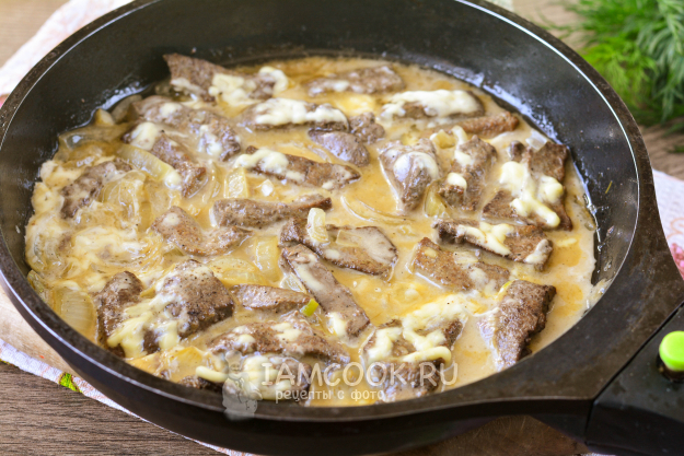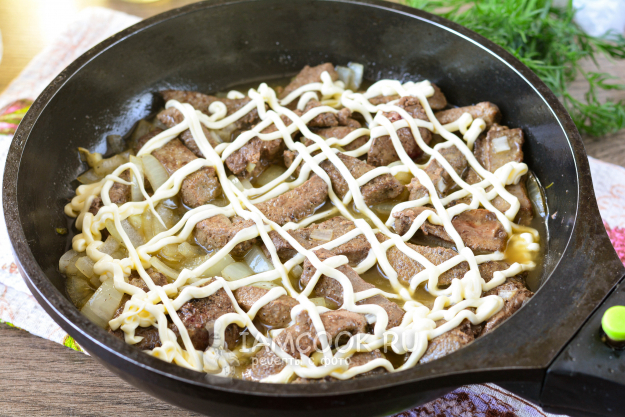 Тушите свиную печень с майонезом на сковороде на медленном огне под крышкой еще 10-15 минут.