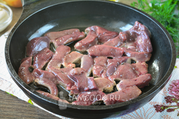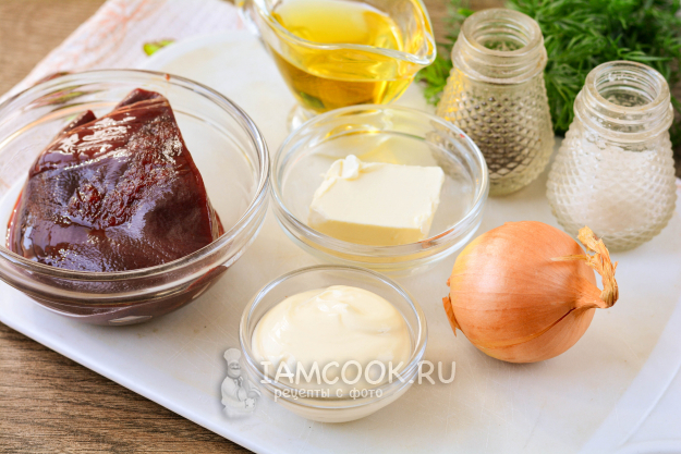 Подготовьте ингредиенты для приготовления свиной печени с майонезом на сковороде.