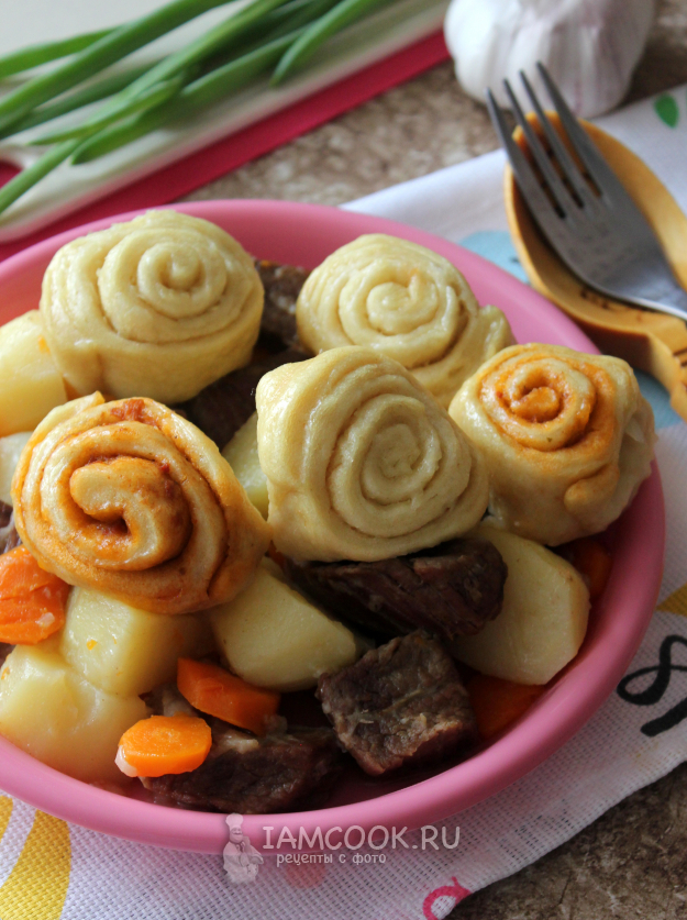Нарежьте полученный рулет поперек на заготовки - будущие нудли. Минут через десять после начала варки картофеля добавьте нудли к остальным ингредиентам. Нужно уложить нудли поверх картофеля так, чтобы они варились на пару. Учтите, что тесто увеличится в размерах.