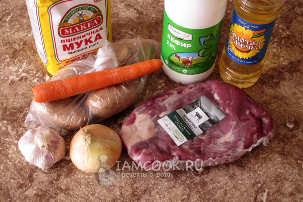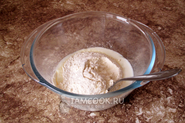 Пока мясо тушится, приготовьте тесто. Для этого нужно перемешать муку с солью и содой и соединить с кефиром.