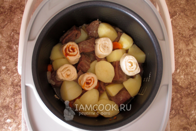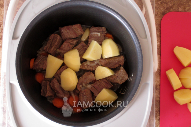 К практически готовой говядине добавьте куски картофеля. При необходимости подлейте ещё горячей воды.