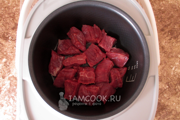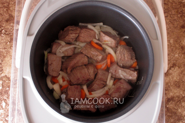 Блюдо удобнее всего готовить в толстостенной посуде с высокими бортами. Это может быть сковорода, сотейник или чаша мультиварки. Первым делом нужно обжарить со всех сторон куски говядины на растительном масле 10-15 минут.