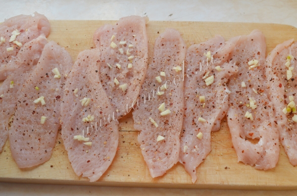Куриное филе нарезать тонкими полосками, немного отбить, посолить и поперчить, посыпать мелко нарубленным чесноком.