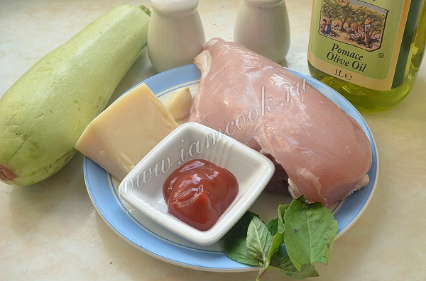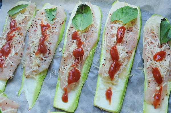 Выложить на кабачки по кусочку куриного филе, листик базилика, посыпать сыром, натертым на мелкой терке, полить томатным соусом.