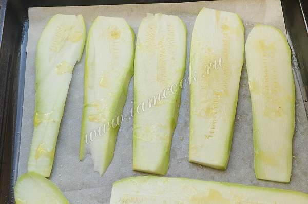 Противень застелить бумагой для выпечки, разложить кабачки, сбрызнуть их растительным маслом, посолить. Запекать 7-8 минут при 180 градусах до мягкости.