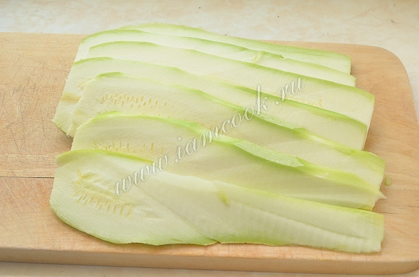 Кабачок вымыть, очистить, нарезать вдоль полосками, примерно 0,3-0,5 см.
