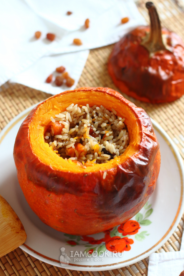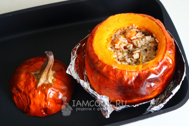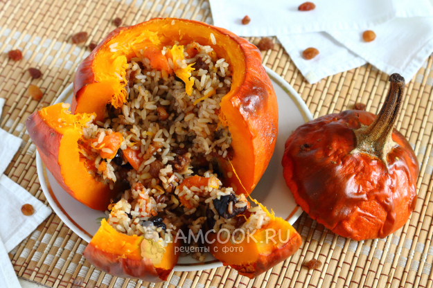 Чтобы получить запеченную корочку снаружи, я сняла верхнюю фольгу через полтора часа. Всего на запекание фаршированной тыквы с рисом и сухофруктами у меня ушло 2 часа.