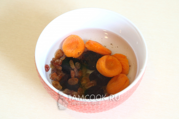 Сухофрукты заливаем холодной водой на полчаса. После чего просушиваем на полотенце.