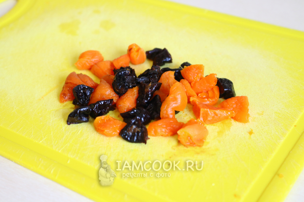 Курагу и чернослив нарезаем на небольшие кусочки.
