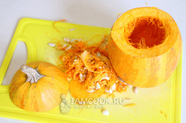Итак, тыкву тщательно моем, подрезаем донышко, чтобы устойчиво стояла, и отрезаем шляпку. Очищаем тыкву от внутренностей: волокон и семечек. Заготовка для фарширования готова.