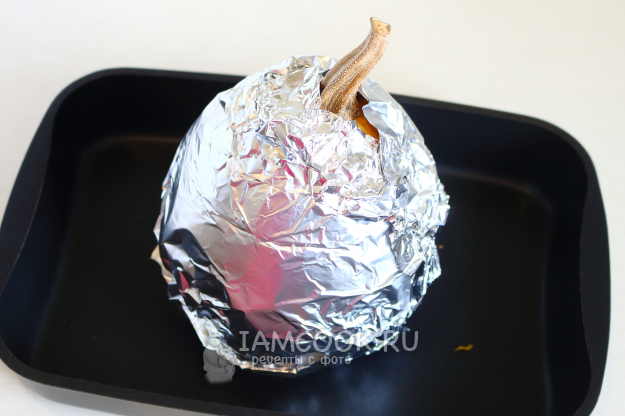 Ставим на противень, закрываем тыквенной крышечкой и оборачиваем сверху также фольгой. Печём при 200-220 градусах 1,5-2 часа. Проверяем готовность тыквы ножом. Если легко протыкается, а мякоть отходит от кожуры - готова!