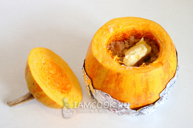 Снизу тыкву оборачиваем фольгой и фаршируем подготовленной кашей. Сверху кладём добрый кусок сливочного масла.