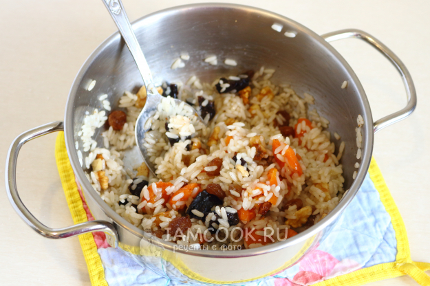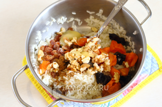 Добавляем к рису щепотку соли, сухофрукты, грецкие орехи (я использовала мелкие, при необходимости разломайте прямо руками или измельчите ножом), мёд (если густой, то немного растопите) и пряности по вкусу (я использую смесь: корица, кориандр, кардамон, мускатный орех, гвоздика, имбирь).