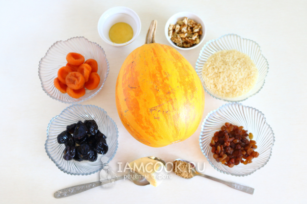 Приготовим нужные компоненты для приготовления фаршированной тыквы с рисом и сухофруктами. Их количество в дальнейшем будет зависеть от размера тыквы. Поэтому пока вы её не разделаете и не увидите, каков внутренний объём для начинки, сложно точно определить количество нужных для неё ингредиентов.
