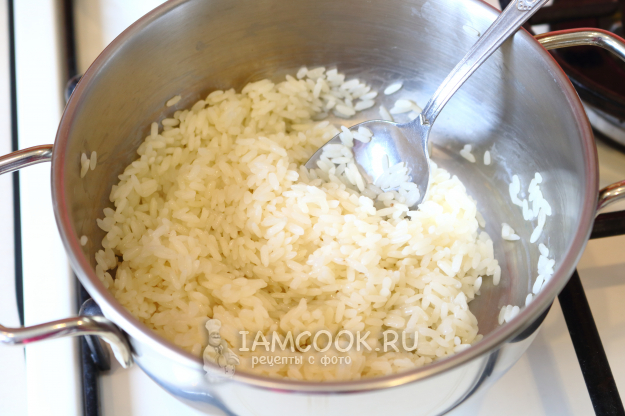 Приступаем к начинке. На килограммовую тыкву с небольшим внутренним объёмом я взяла полстакана сухого риса. Крупу промываем, заливаем холодной водой в пропорции 1:1 и отвариваем до впитывания жидкости и получения полуготовой каши.