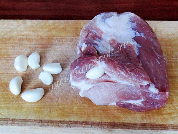 В куске мяса сделайте проколы и поместите в них зубчики чеснока.