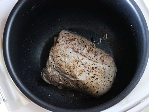Установите на мультиварке режим "жарка" или "выпечка" и в течении примерно десяти минут обжарьте кусок мяса со всех сторон - "запечатайте" его в корочку.