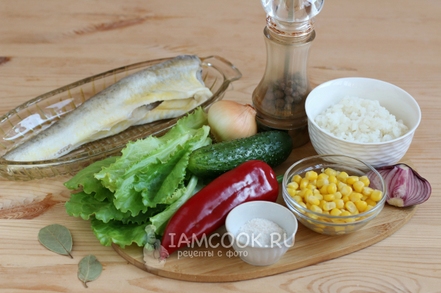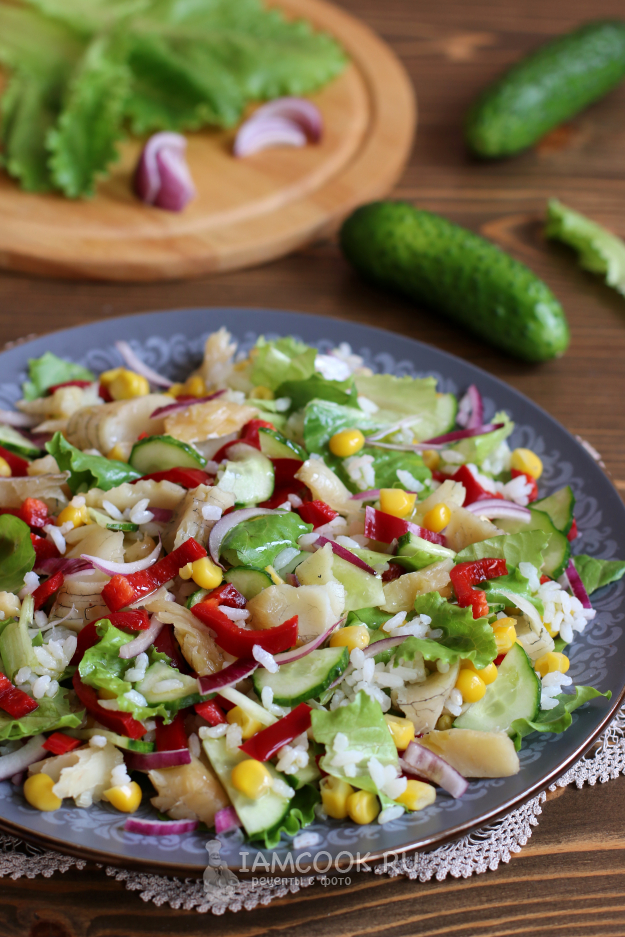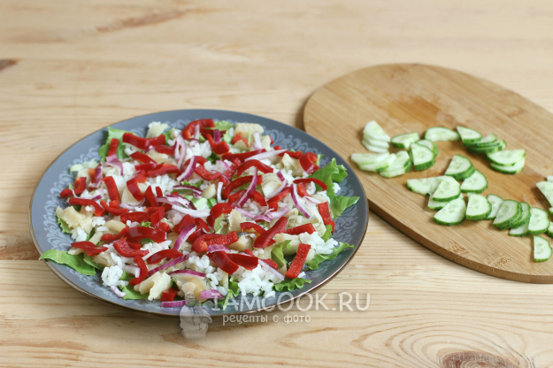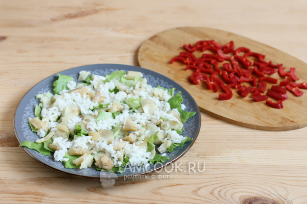 Добавляем к салату кусочки наваги и отваренный заранее рис. Нарежем брусочками болгарский перец.