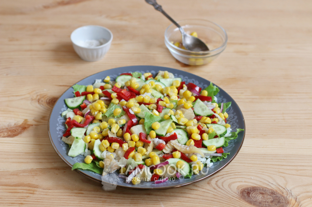 Затем добавляем консервированную кукурузу и немного соли с молотым перцем.