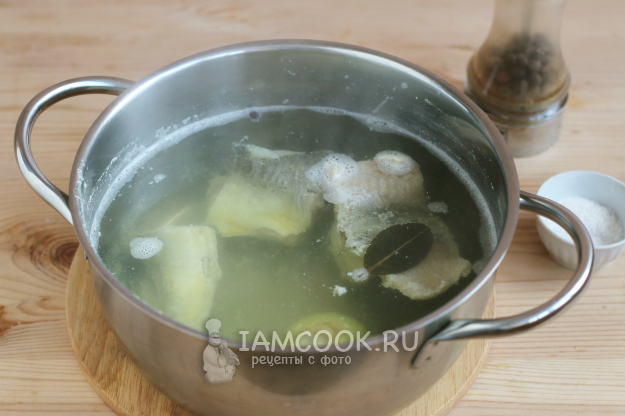Навагу разморозим, затем очистим от чешуи, срежем плавники, нарежем на несколько кусков и отварим в подсоленной воде с добавлением репчатого лука, лаврушки и 3-4 горошин чёрного перца 20 минут после закипания.