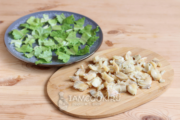 Отваренную рыбу остудим, разберём на кусочки, удалив все кости. Листовой салат порвём руками и разложим на тарелке или блюде, в котором непосредственно будет подаваться салат с навагой.