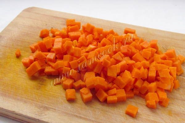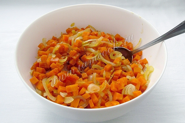 Для начинки тыкву нарезать мелким кубиком. На терке тереть ее не советую, хочется, чтобы текстура начинки была рассыпчатой, а не склеилась в одну массу.