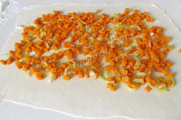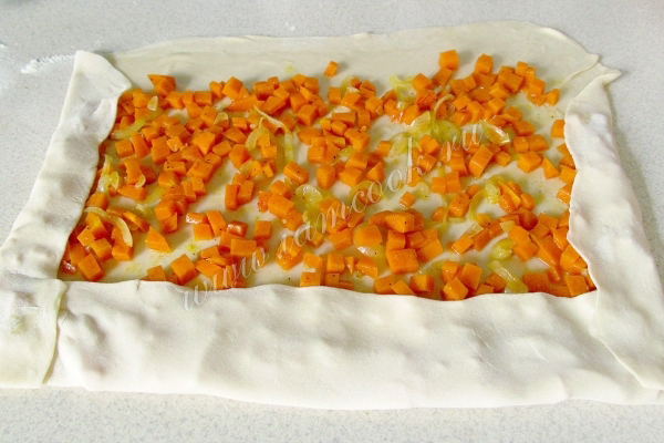 Тесто раскатать в очень тонкий пласт. Смазать растительным маслом и выложить тыкву по всей поверхности, немного отступая от краев.