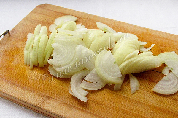 Лук нарезать тонкими полукольцами. Слегка поджарить в 2 ложках растительного масла. Даже не жарить, а дать луку отдать свой аромат маслу, он должен оставаться белым.