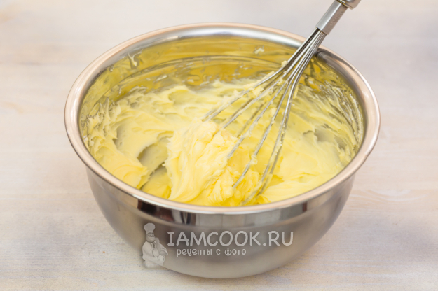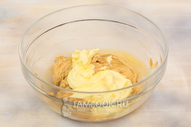 В отдельной миске соедините мягкое сливочное масло и сахарную пудру. Взбейте смесь до состояния пышного крема.