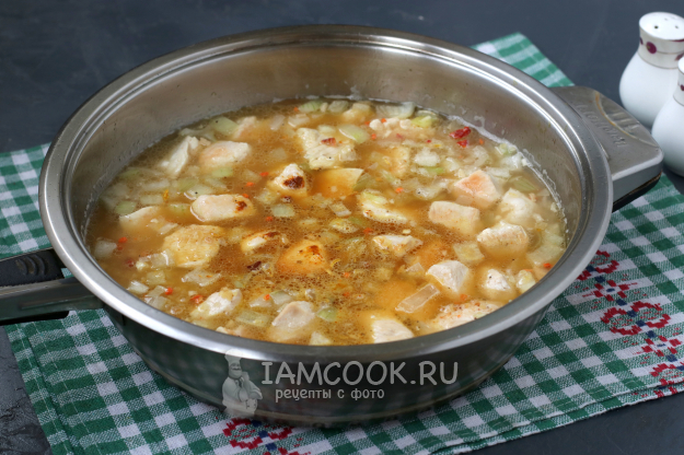 В сковороде разогреть подсолнечное масло, выложить к нему кусочки курицы и обжарить до золотистой корочки. Добавить в сковороду лук и слегка обжарить вместе.
