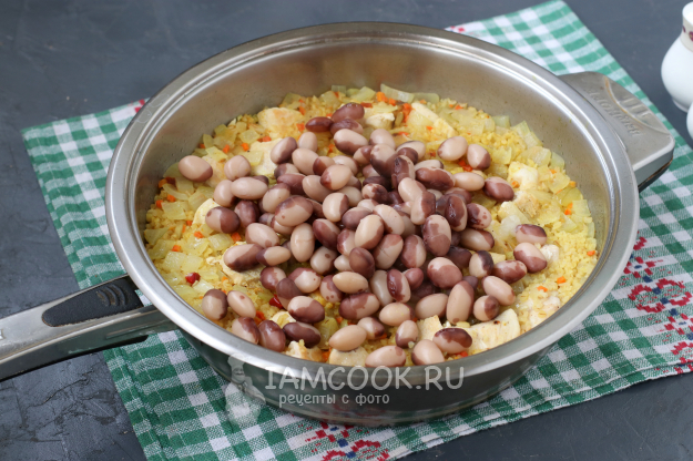 Поставить варить фасоль, залив её свежей холодной водой. Варка фасоли занимает 30-40 минут, при условии что она была залита водой несколько часов. Пока варится фасоль, можно начинать приготовление блюда. Куриное филе хорошо промыть и обсушить, нарезать средними кусочками.