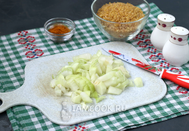 Почистить лук и нарезать его кубиками.