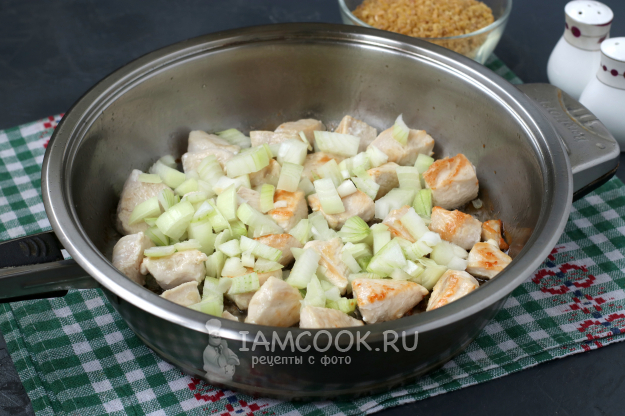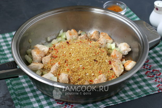Добавить в сковороду булгур. Сейчас выбор булгура обширен: есть как самостоятельная крупа, так и с добавлением мелких сушёных овощей или зелени. Перемешать булгур с курицей и луком.