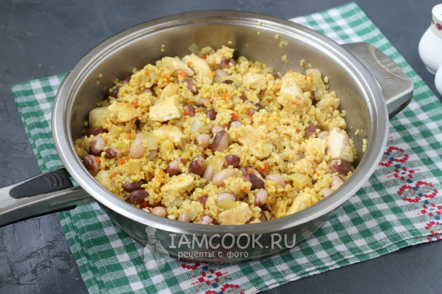 За это время проверить на готовность фасоль, слить с неё отвар. Когда булгур с курицей будут готовы, добавить в сковороду фасоль.