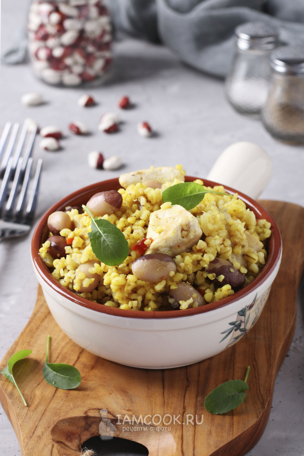 Разложить булгур с курицей и фасолью по тарелкам и подать к столу.