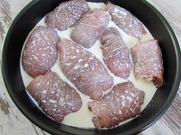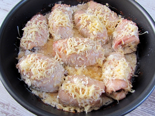 Залейте сливками. Запекайте куриные рулетики в предварительно разогретой до 220 градусов духовке примерно 30-35 минут.